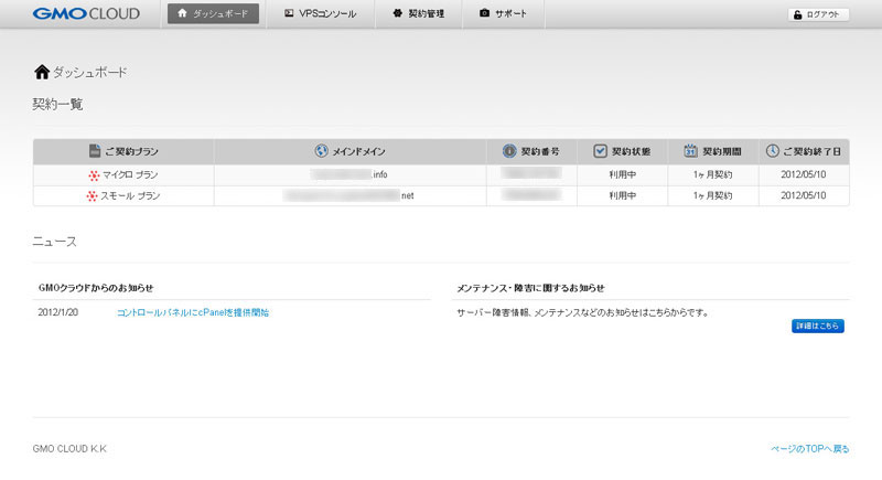 | VPS契約一覧 | ご契約プランの契約期間、ご契約終了日をご確認いただけます。 |