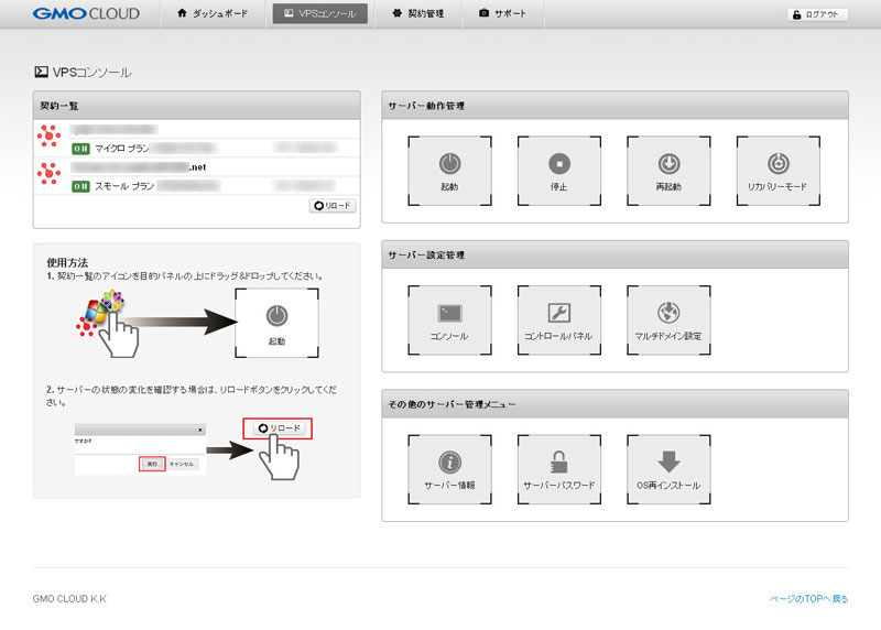 | サーバー情報 | ご契約プランの料金、稼働状況詳細をご確認いただけます。 |