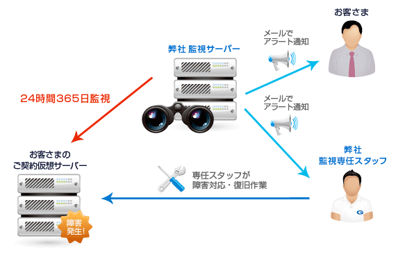 | 監視一次復旧サービス | 死活監視・ポート監視でアラートが発生した際の対応 お客さまへメールにてご連絡およびサーバーの再起動 |